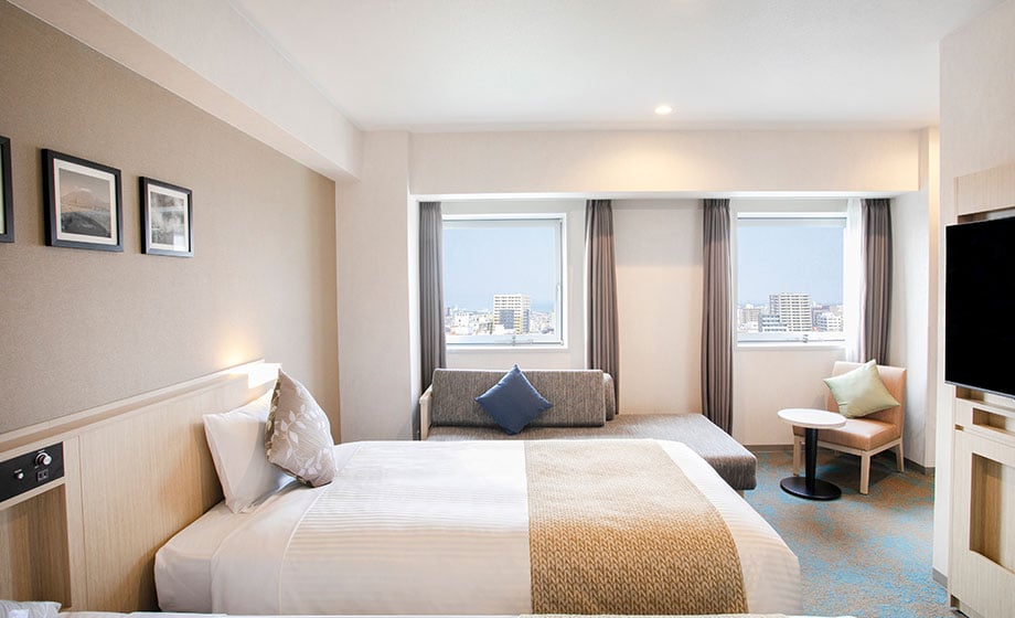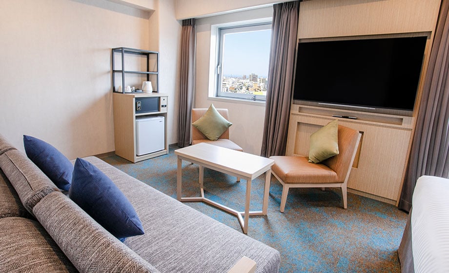 客房面積26.1m²~。提供寬160cm的大型床鋪、按摩椅及大型沙發的大床房型。備有兩個床鋪及大型沙發的雙人雙床房型。兩種房型皆提供寬敞的空間,讓賓客享受奢華的入住時光。